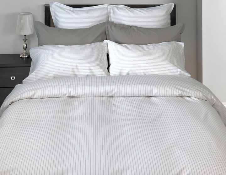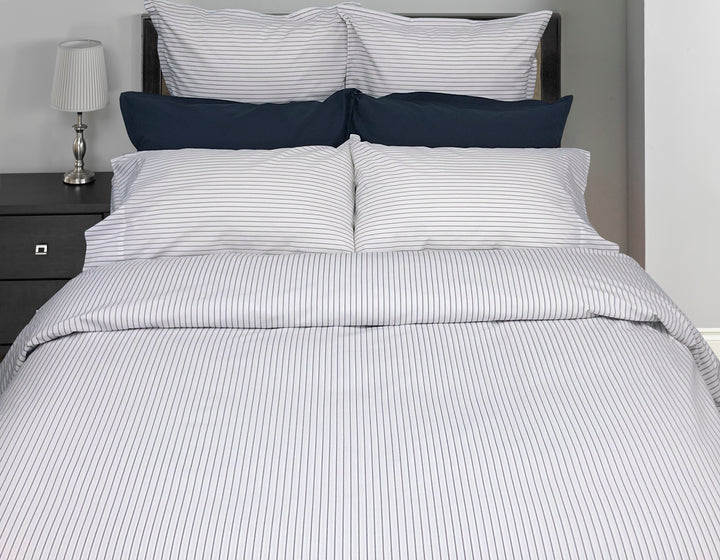 Meet the Georgia Stripe, a fresh take on timeless design. This collection reimagines the traditional stripe with a sophisticated "twist" that adds instant character to any bedroom. Masterfully woven in Portugal and tailored with precision in Canada, its signature softness offers an unparalleled sleep experience. Whether you choose the deep tones of Navy or the serene touch of Dove Grey, it’s the perfect piece to layer with our Percale Deluxe solids.