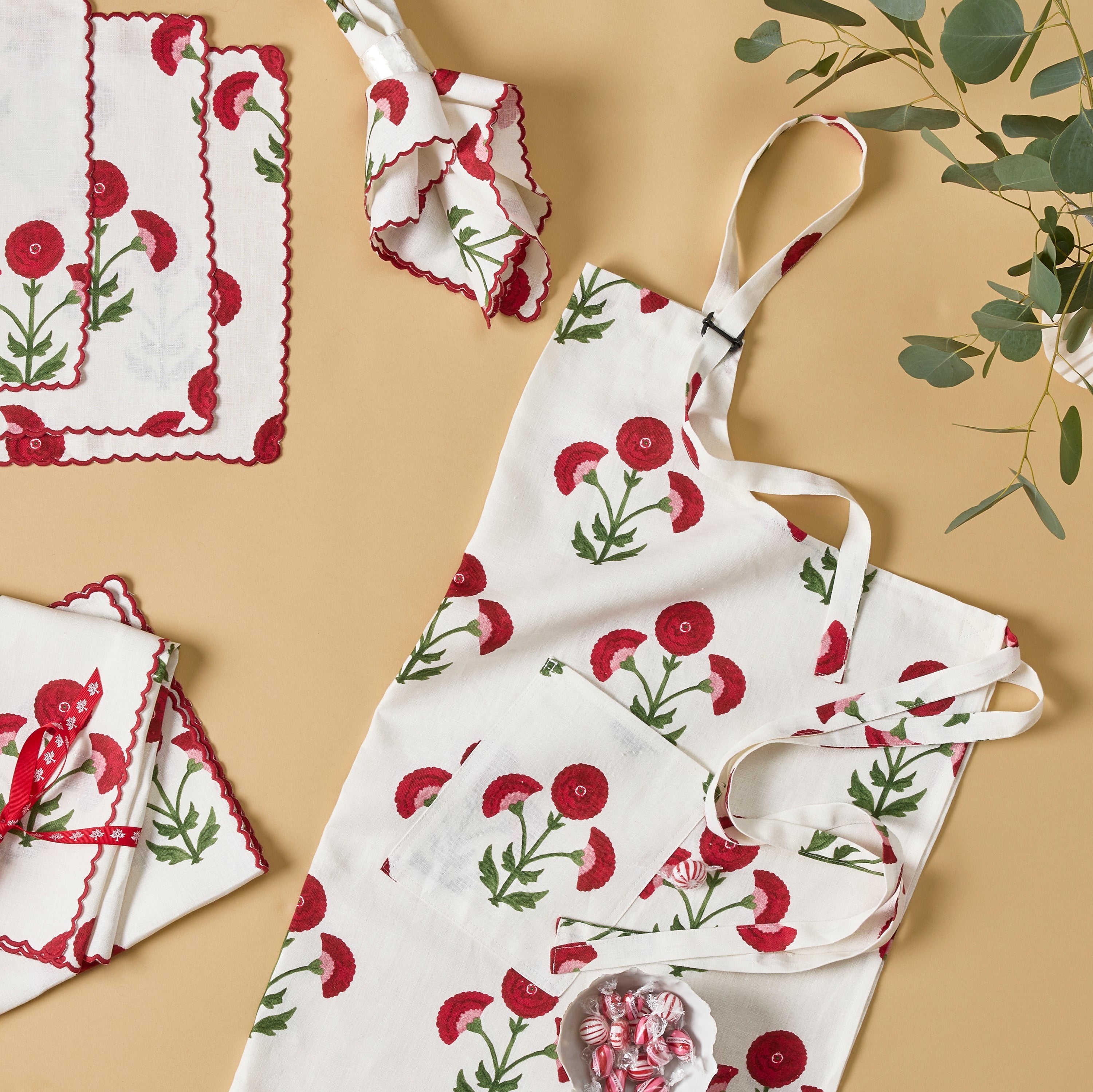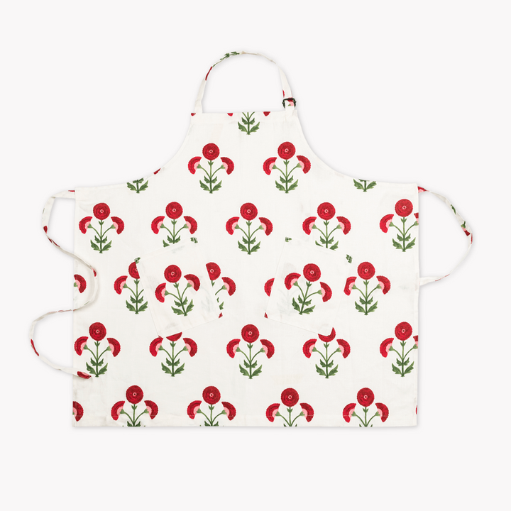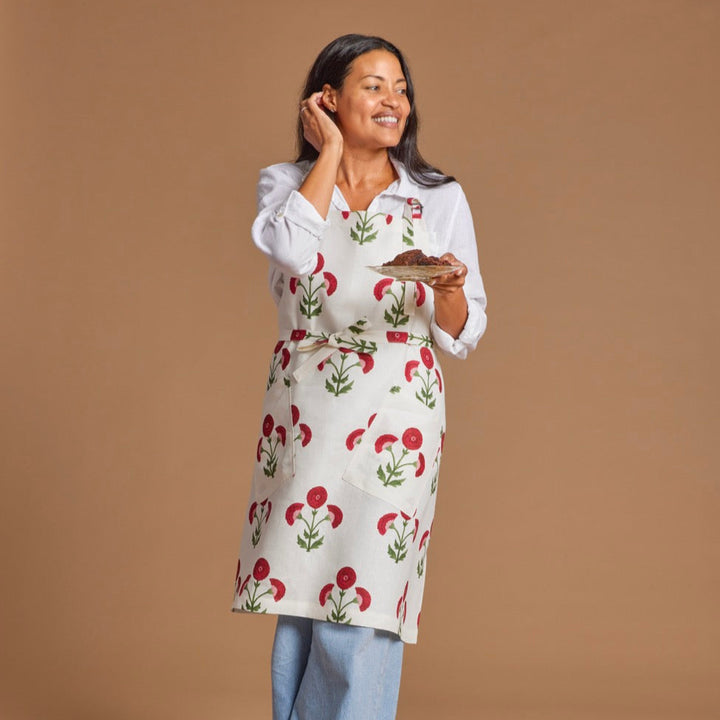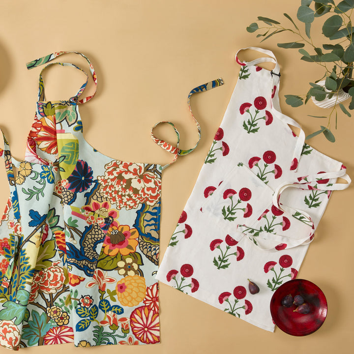 Découvrez l'alliance parfaite du style et de la fonctionnalité avec notre tablier en lin imprimé Signature Schumacher. Fabriqué en 100 % lin, ce tablier est conçu pour un look de cuisine chic, avec un imprimé Schumacher original de bouquets fleuris aux tons écarlates qui ajoutent une touche fantaisiste à votre routine culinaire.