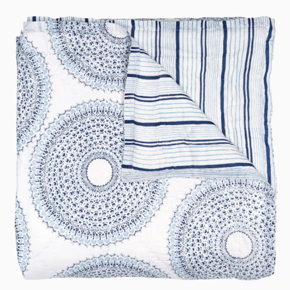 Give your bed a bohemian twist with this soft-as-a-cloud cotton voile quilt. Featuring a reversible design with coordinating stripes on the back, it offers effortless style and lightweight comfort for any season. Hand-stitched for a beautifully textured look, this quilt is an artisanal masterpiece.